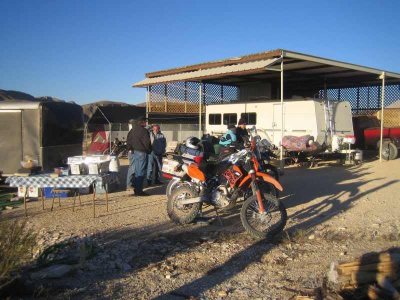 The next morning, I crawl out of my tent and look at the temp reading on my bike and am not surprised to see 28F. David has this down to a science and had the coffee pot rigged so all he had to do was roll over in his cot and plug it in.